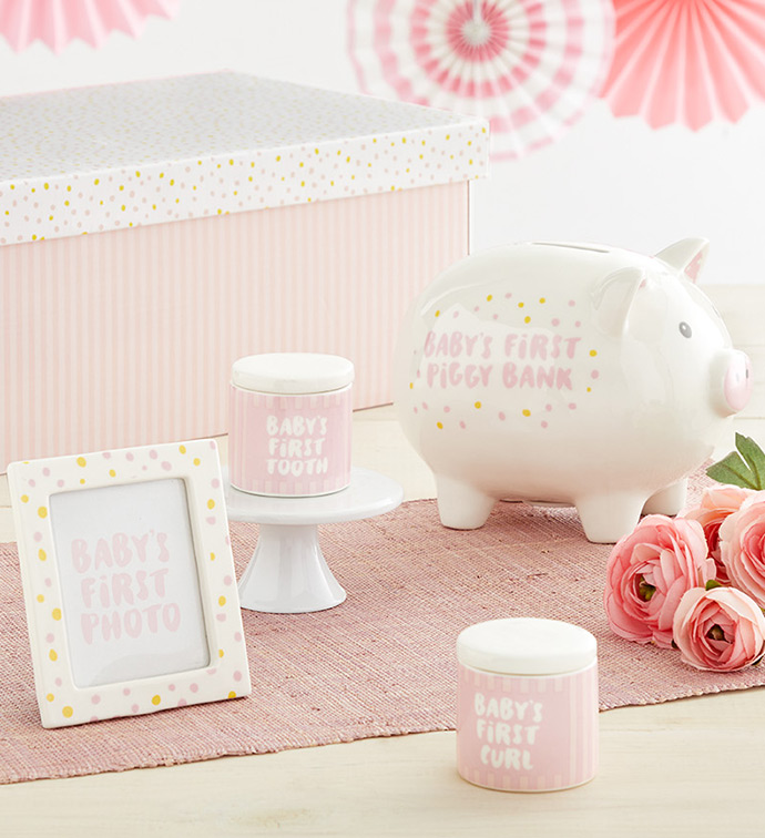 Help parents celebrate & remember baby's important "Firsts" in classic style with this adorable set of pink & chocolate brown dot ceramics. They'll think of you as they use the "My First Curl & My First Tooth" boxes, the "My First Photo" frame, and the "My First Piggy Bank". And the keepsake box will be the perfect spot to store their cherished baby mementos!