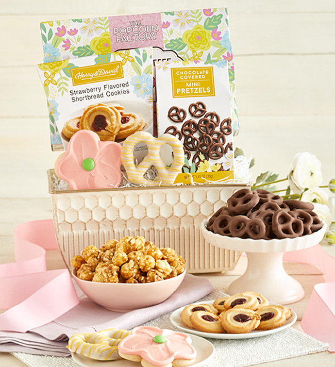 Arriving in an elegant white tin, this collection of delectable goodies offers an assortment of sweet creations. There are snack-size chocolate chip and buttercream-frosted celebration cookies from Cheryl’s Cookies, Harry & David® shortbread cookies, white chocolate-covered OREO® cookies, milk chocolate-covered pretzels, and The Popcorn Factory® kettle popcorn. Choose from the Deluxe, Grande, and Supreme options for bigger collections of delectable snacks to share.