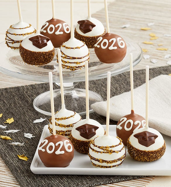 Graduation has finally arrived and they are ready for the next chapter and for the well-deserved graduation celebrations. Send your best wishes and congratulations to the new graduate with truffle cake pops that take the cake. These trend-forward treats are lovingly hand-made by a small artisan bakery that’s been featured on The Today Show and Rachel Ray! The luscious truffle cake centers are covered with delicious chocolate, then hand-decorated to perfection. Easy to share, these gourmet truffle cake pops are an indescribably delicious, A-list dessert that they’re certain to love!