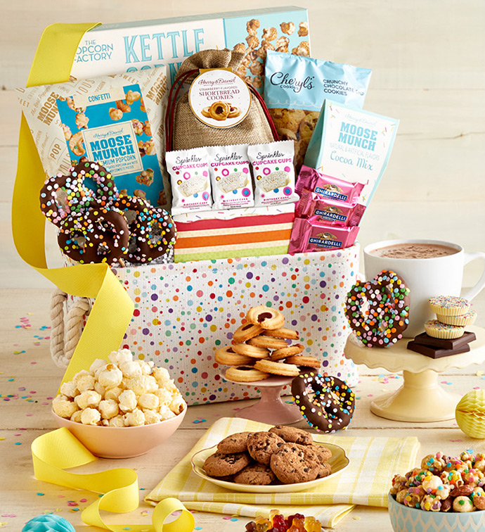 Surprise the ones you love on their birthdays with a scrumptious gift. We’ve included an array of delights from our brands: Harry & David, Cheryl’s Cookies, The Popcorn Factory, and Simply Chocolate. They’ll indulge in specialty cookies, crunchy snacks, rich chocolates, and more all nestled in a reusable canvas basket with rope handles. Make all their wishes come true with a gift full of gourmet favorites. Select the Deluxe or Grande basket.