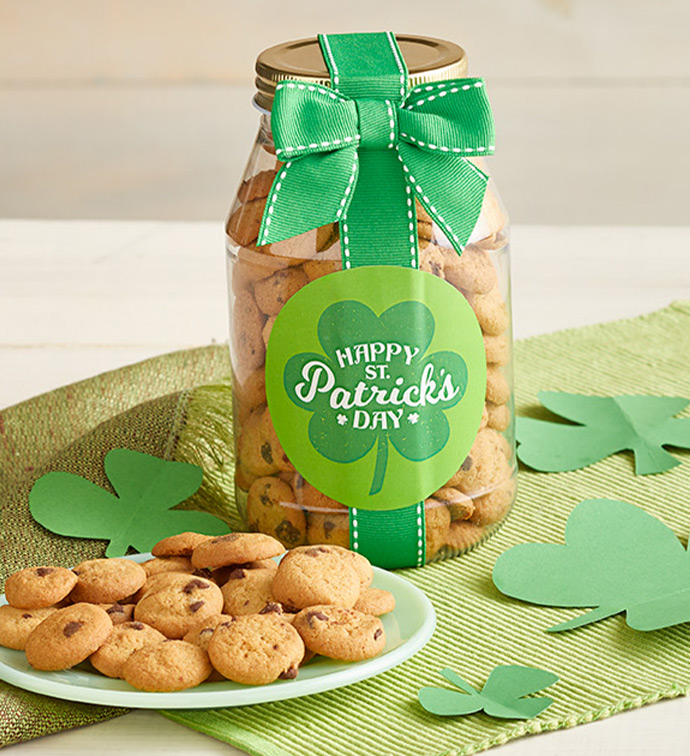 Send a delicious treat to your favorite leprechaun with this Happy St. Patrick's Day! Chocolate Chip Cookie Jar filled with the tastiest mini-chocolate chip cookies they’ll ever eat! These tasty morsels are packed in a resealable quart jar tied with a bright green ribbon. These are a real "Pot of Gold"!
