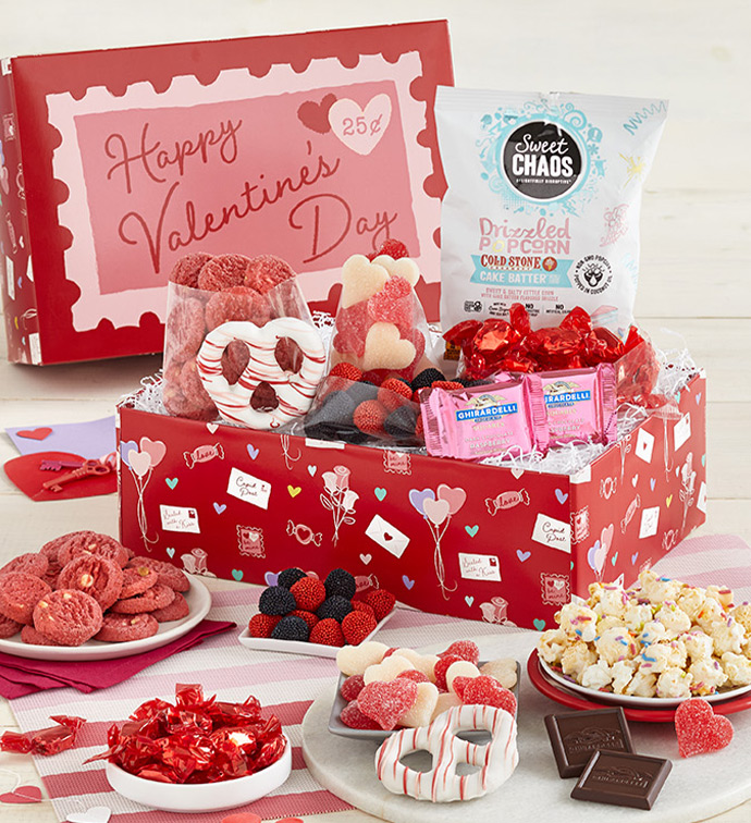 Make it an extra “Happy Valentine’s Day” with a special delivery of cookies, chocolates, and confections. The tasty assortment includes milk chocolate-covered gummy bears, cake batter popcorn, red velvet batter cookies, white chocolate-covered pretzel, and dark chocolate raspberry squares. The decorations on the box are as fun-loving and sweet as the treats inside, and this winning combination will surely spread a bounty of beautiful smiles this Valentine’s Day.