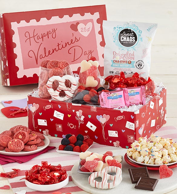 Make it an extra “Happy Valentine’s Day” with a special delivery of cookies, chocolates, and confections. The tasty assortment includes milk chocolate-covered gummy bears, cake batter popcorn, red velvet batter cookies, white chocolate-covered pretzel, and dark chocolate raspberry squares. The decorations on the box are as fun-loving and sweet as the treats inside, and this winning combination will surely spread a bounty of beautiful smiles this Valentine’s Day.