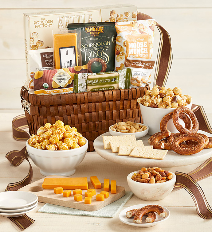 Our #1 Gift Basket! Send this graceful, sumptuous gift basket that is sure to please anyone's taste buds. This handcrafted gift is brimming with savories and sweets from our well known brands like Harry & David® and The Popcorn Factory®. We included an abundance of tasty and unique snacks paired with organic dried fruit for easy gift giving. This beautifully woven basket is hand-tied with a brown and copper bow to make the gift complete. Select the Deluxe, Grande, or Supreme basket and create a memory that will last forever.