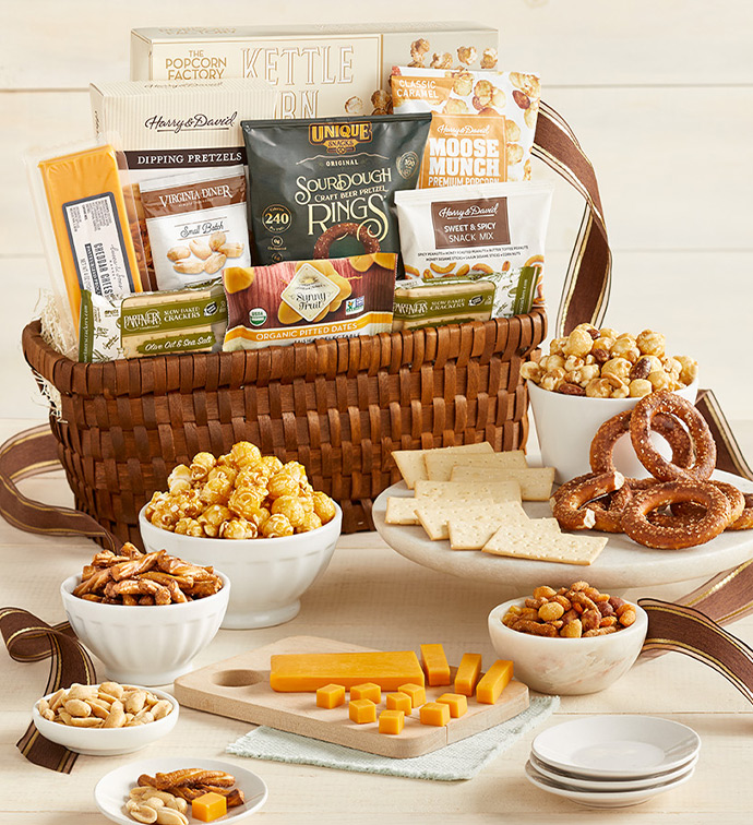 Our #1 Gift Basket! Send this graceful, sumptuous gift basket that is sure to please anyone's taste buds. This handcrafted gift is brimming with savories and sweets from our well known brands like Harry & David® and The Popcorn Factory®. We included an abundance of tasty and unique snacks paired with organic dried fruit for easy gift giving. This beautifully woven basket is hand-tied with a brown and copper bow to make the gift complete. Select the Deluxe, Grande, or Supreme basket and create a memory that will last forever.