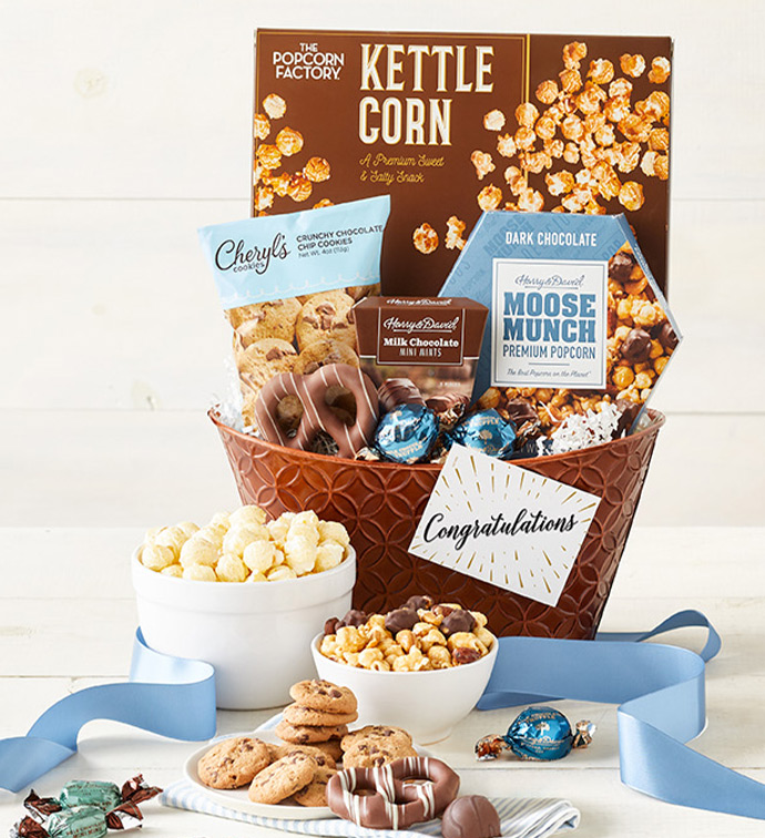 Send your congratulations to someone special with this stylish basket brimming with favorites perfect for celebrating. They will discover creamy milk chocolate treats, fresh cookies, premium chocolate truffles and unmatched taste in every bite. This impressive basketful of goodies will certainly bring happiness and exceed their expectations. Made with care, this beautiful copper basket is tied with an antique blue ribbon.