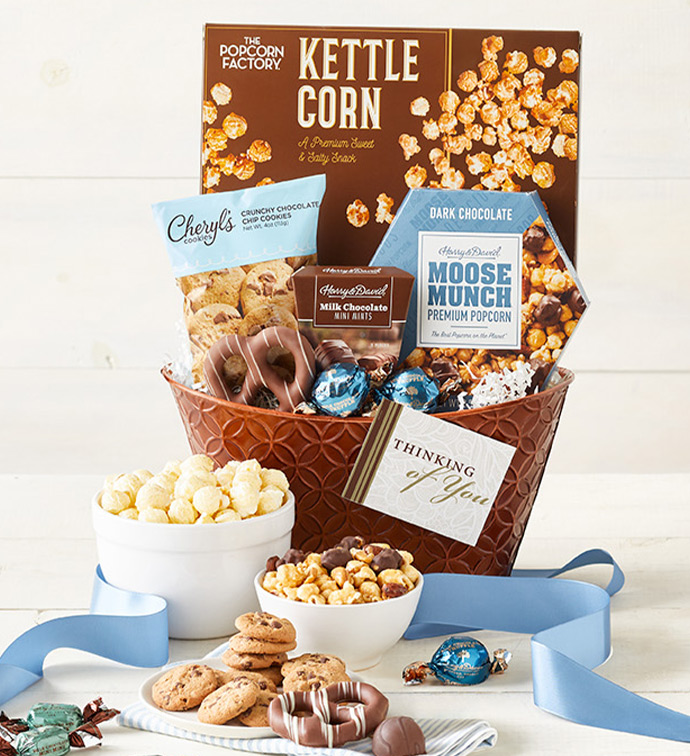 Let someone know they're on your mind with this delicious gift basket of luscious treats featuring our famous brands: Harry & David®, Moose Munch®, The Popcorn Factory® and Cheryl's Cookies. This stylish basket is brimming with favorites perfect for celebrating every family gathering. They will discover creamy milk chocolate treats, fresh cookies, premium chocolate truffles and unmatched taste in every bite. This impressive basketful of goodies will certainly bring happiness and exceed their expectations. Made with care, this beautiful copper basket is tied with an antique blue ribbon.