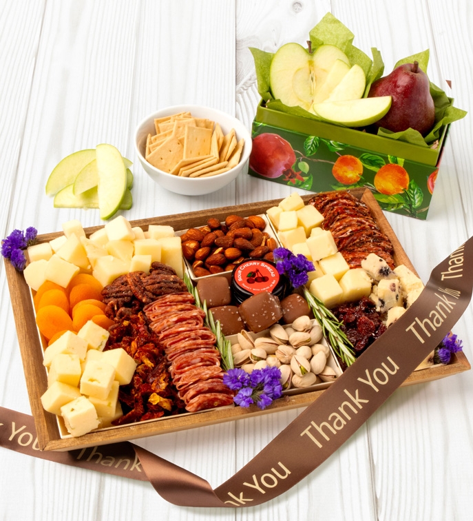 Elevate your appreciation with this abundant charcuterie experience. Featuring a curated selection of award-winning cheeses, savory Italian salami, candied pecans, pistachios, dried fruits, and sour cherry spread, this board balances sweet and savory for every palate. Fresh apples and pears add a crisp finishing touch, making this a generous way to say thank you to someone special.
