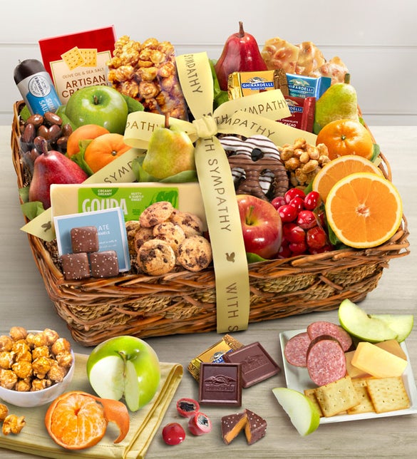 Send this impressive and caring expression of your deepest sympathy and and you'll make a difference in their day. This handsome walnut stained wicker & rope basket is tied with a sympathy ribbon and filled with fresh fruit, nuts, snacks, chocolate and other candies. Your thoughtfulness will be remembered.