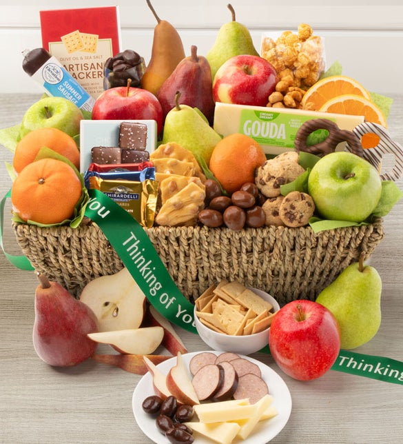 Send comfort and courage with this impressive basket filled with premium quality gourmet fruit, savories, and sweets. This handsome seagrass basket is filled with nine types of fresh fruit, nuts, summer sausage, cheese, snacks, chocolate, and other candies. A reassuring gesture shows your friendship and how much you care!