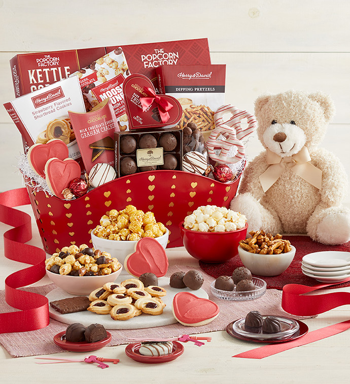Express your affection and make connections this Valentine’s Day with a gift basket featuring sweet treats from across our family of brands. The treasure trove includes Harry & David® Moose Munch® Premium Popcorn, a frosted heart cookie from Cheryl’s Cookies, kettle popcorn from The Popcorn Factory, Simply Chocolate® truffles, chocolate-covered peanuts, and more gourmet goodies. Everything arrives thoughtfully displayed in a cute red tin basket with cutout hearts to help make your valentine feel even more special. Choose from Deluxe, Supreme, Ultimate or Ultimate with plush.