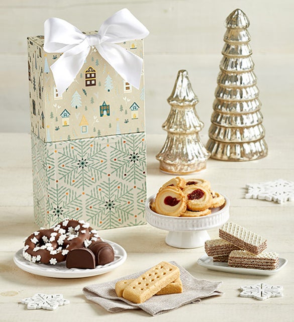 Celebrate the holidays with a wonderfully wintry gift. This two-tier tower is brimming with a bevy of gourmet goodies, starting with indulgent chocolate truffles and crisp strawberry-flavored shortbread cookies from Harry & David. It gets even sweeter with Walker’s® shortbread fingers and Dolcetto Cubetti® hazelnut wafer cookies. For a finishing touch of festivity, we’ve also included chocolate-covered pretzels shaped like snowflakes. Made to spark merriment, this is a delightful gift to share with the ones you love whether you’re together or apart.